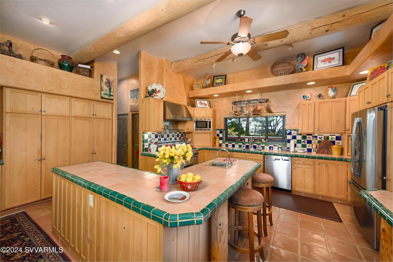 Panoramic Red Rock Views in the Coveted Chapel. Custom Southwest House Capturing the Vibrant Hues of the Sedona Landscape. Featuring Beautiful Anderson Windows, Ceiling Vigas, Satin Sealed Saltillo & Italian Tile Flooring. Kiva Fireplace, Knotty Alder Doors & Cabinets, Ceiling Fans Throughout. Cooks Kitchen with Dacor 6 Burner Gas Stove, Convection Oven & Warming Racks, Bosch Dishwasher, G.E Profile French Door Refrigerator, Italian Tile counters with Vibrant, Decorative Talavera Tile Backsplash & Ample Knotty Alder Cupboards.